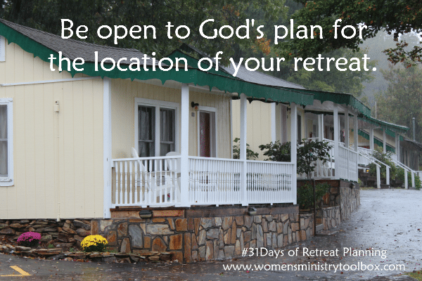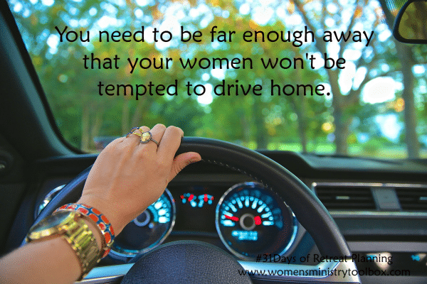 I recommend you venture 1-2 hours away from your church. If you’re asking your women to drive more than 2 1/2 hours, the retreat location needs to be something really special or unique. I would not ask your women to drive more than 4 hours – and that is really pushing it! You need to be far enough away that your women won’t be tempted to drive home as some will not return!.